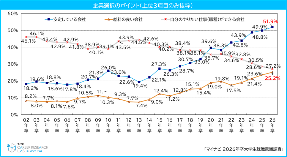 就職観の推移 ※数字は上位3項目のみに記載 / マイナビ 2026年卒大学生就職意識調査 図1