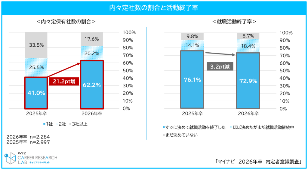 労働市場全体としては、「大卒求人倍率 1.66倍(26卒):リクルートワークス研究所 第42回 ワークス大卒求人倍率調査(2026年卒)」と堅調で、新人にとって「選べる側」という感覚は変わらず根底にあります。しかし、内々定は「1社のみ」が62.2%へ増加しており、マッチングが早期に固定化し、“迷わず決める”学生が増えています。