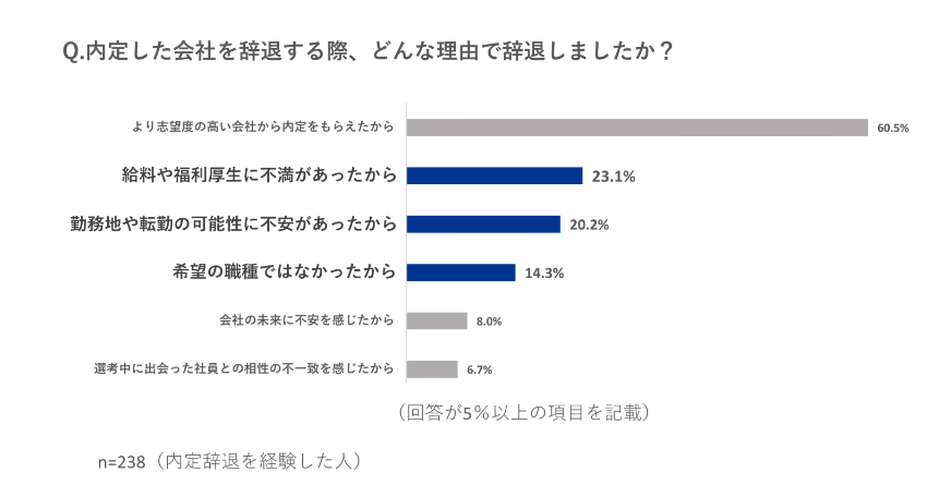 参考として、以下は25年卒対象の調査ですが、内定した会社を辞退した理由を見てみると、当然他社からのオファーが最大ではありますが、「福利厚生に不満があったから」「勤務地や転勤の可能性に不安があったから」「希望の職種ではなかったから」もあがっています。