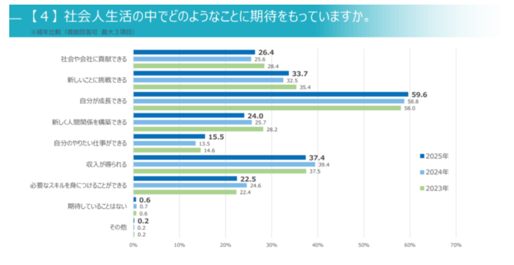 しかし一方で、25年卒対象の調査ですが、実際に働き始めてからの期待としては、「成長すること」が1位となっており、その割合は過去2年と比べても最多を示しています。会社選びの段階では安定性・ワークライフバランスを重視するものの、実際に働く際には成長の観点で満足を求める人物像が浮かんできます。