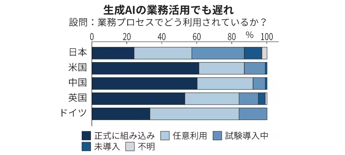 日本経済新聞 「生成AI利用で日本企業最下位 PwC5カ国調査、経営層に意欲乏しく」 2025年6月23日