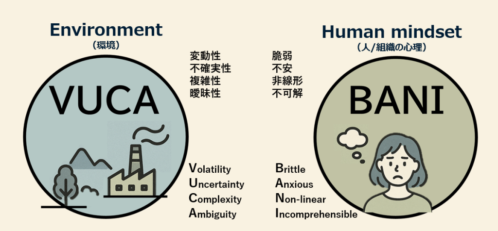 一方、近年は不確実さが常態化し、変化の速度・連鎖が増す中で、「人と組織の心理・反応」に焦点を当てるBANIという視点が重要になっています。BANIはBrittle(脆弱)、Anxious(不安)、Non-linear(非線形)、Incomprehensible(不可解)を指し、予測不能な出来事に対する脆さや不安の増幅、成果が直線的に積み上がらない非線形、説明が難しい不可解さを前提に置きます。