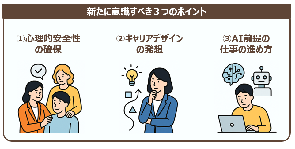 以上を踏まえて、新入社員研修をどのようにバージョンアップすればよいでしょうか。ここでは大きく3点を挙げたいと思います。
