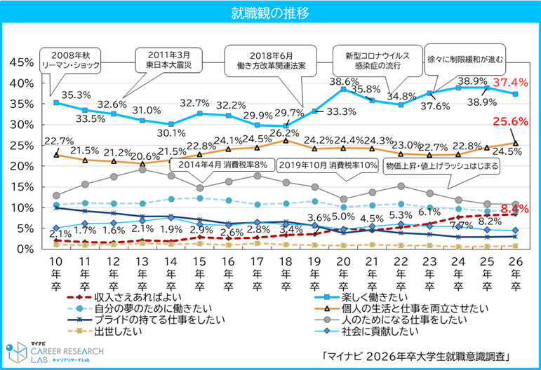 次に就職観は、「楽しく働きたい」が37.4%で最多ですが、「個人の生活と仕事を両立させたい」25.6%が3年連続増加しています。同時に「収入さえあればよい」8.4%も5年連続増しており、価値観が安定志向かつウェルビーイング志向に明確にシフトしていると言えるでしょう。