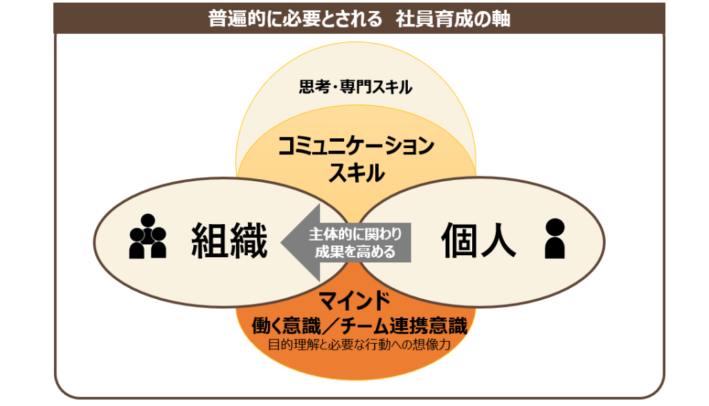 働くことに対する心構えや組織で働く上での連携意識など社会人活動の土台となる「マインド」は、従来は各自が成長する過程において学び育くむものでした。しかし、生活環境の変化によりこれらのマインドが育ちにくくなっており、配属後に先輩側が戸惑いを感じて手こずったり、本人も不安定になりやすい傾向につながります。このような活動の土台となるマインドですが、職場ではいちいち教えてきませんでしたし、いざ説明しようにも育ってきた背景が異なることで世代を超えた伝え方が難しくなってきているため、なかなか現場で説明できるものでもありません。そして「コミュニケーションスキル」も、あらゆる活動場面で必要な土台スキルであるにもかかわらず、社会的変化によって成長過程で磨かれる機会が減っています。このようにこの2つの土台は、時代や状況に伴い相手に必要な指導内容は変化しますが、大きな環境変化に入るときに普遍的に必要な「育成の軸」と捉え、新人研修を構成しておく必要があると考えています。