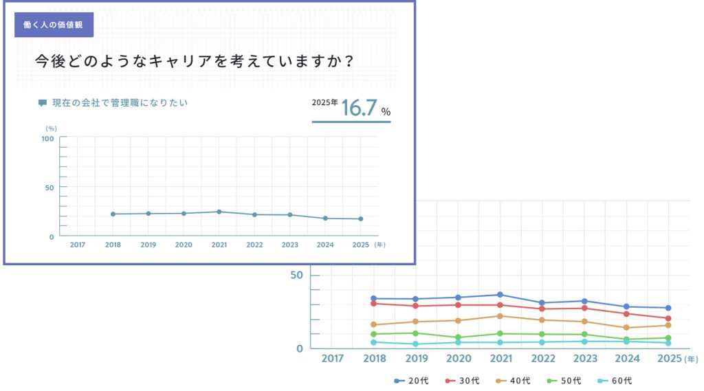 さらに深刻な問題としては、「管理職になりたくない」と考える社員が増加していることが挙げられます。パーソル総合研究所「働く10,000人の就業・成長定点調査 2025」では、「現在の会社で管理職になりたい」人は16.7%にとどまり、若手ほど管理職志向が低下していると報告されています。