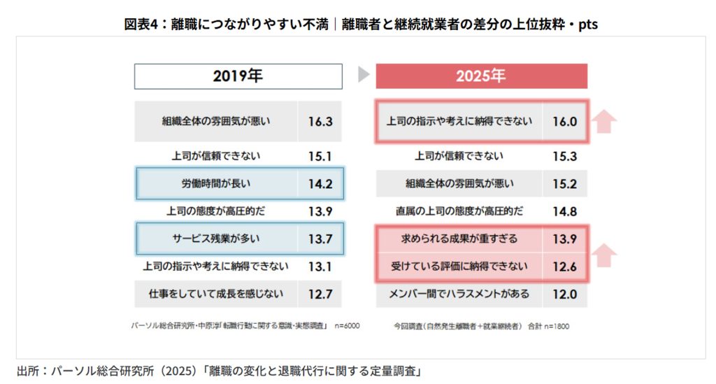 パーソル総合研究所「離職の変化と退職代行に関する定量調査」のデータにおいて、コロナ禍前の2019年と2025年のデータを比較すると、離職者の不満は大きく様変わりしています。