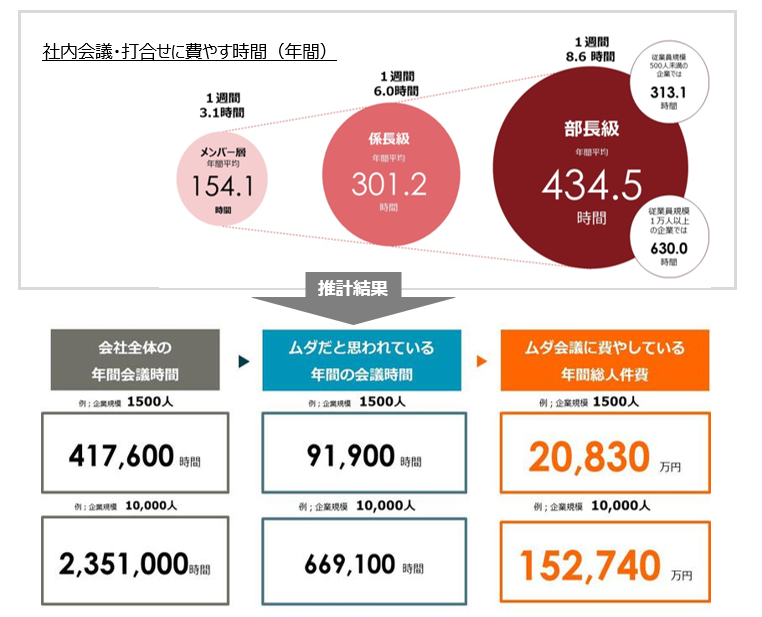 パーソル総合研究所の調査では、1万人規模の企業でムダな社内会議時間が年間約67万時間、損失額が年間約15億円に達するという推計も示されています。